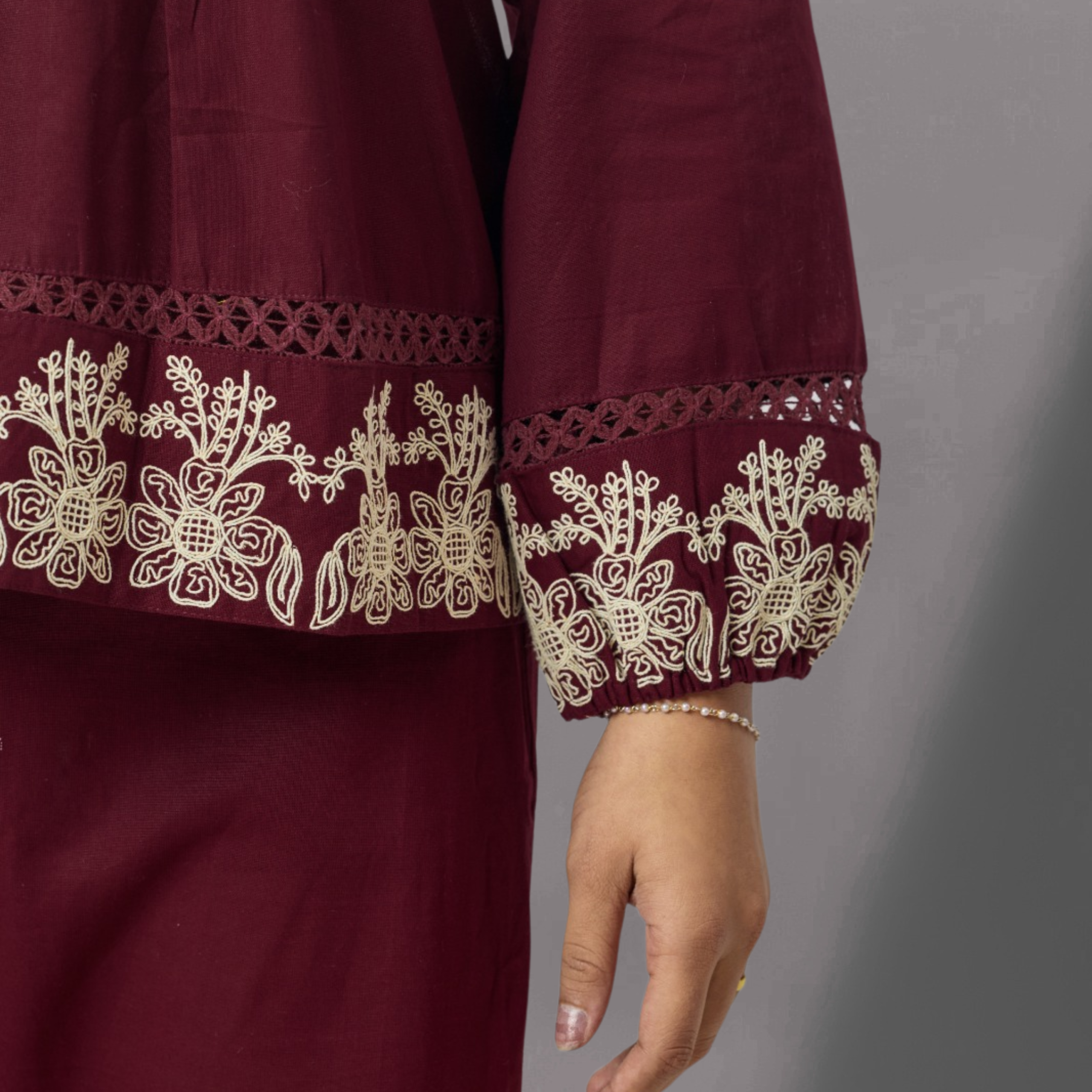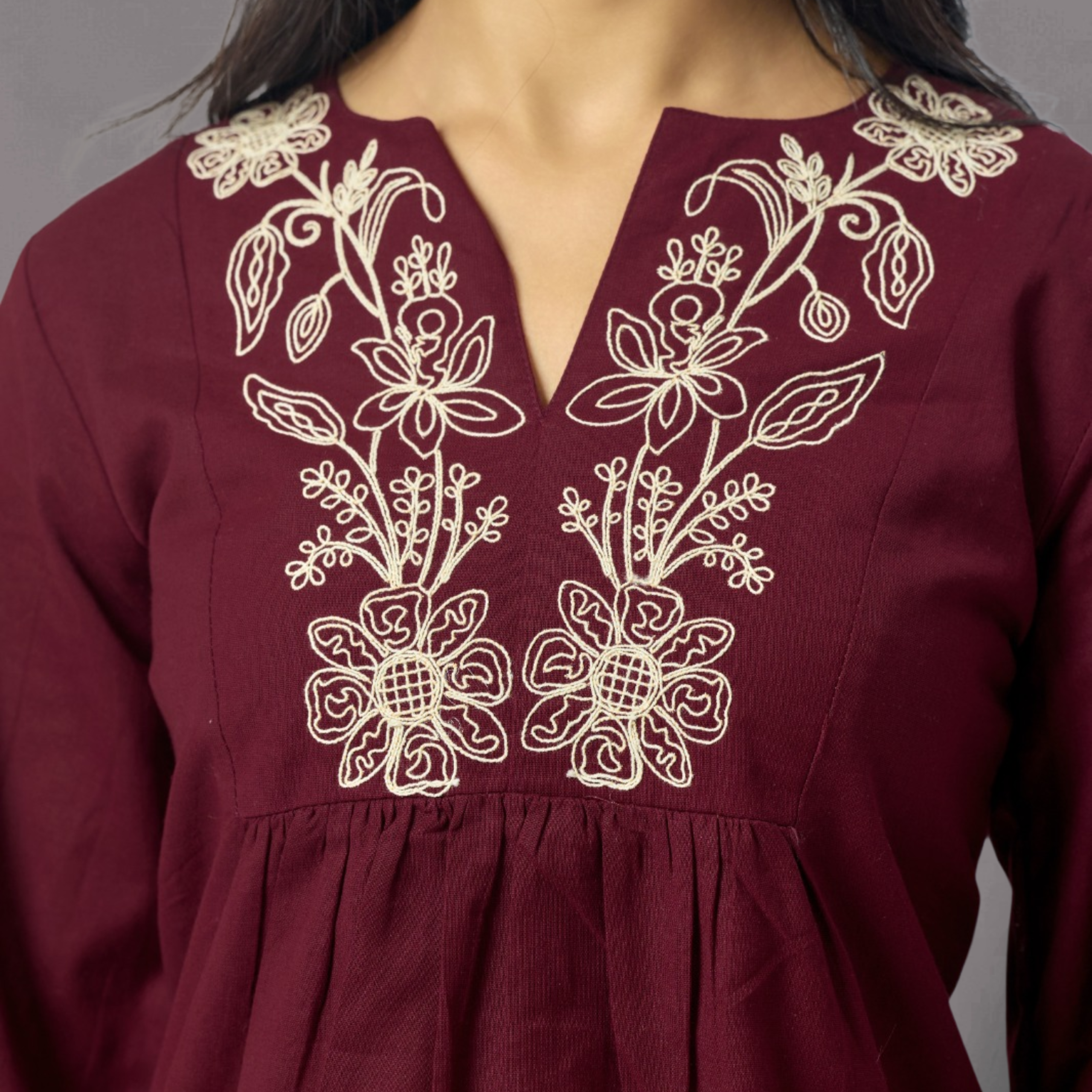 - Fine embroidery on neckline, cuffs, and hem enhances overall look