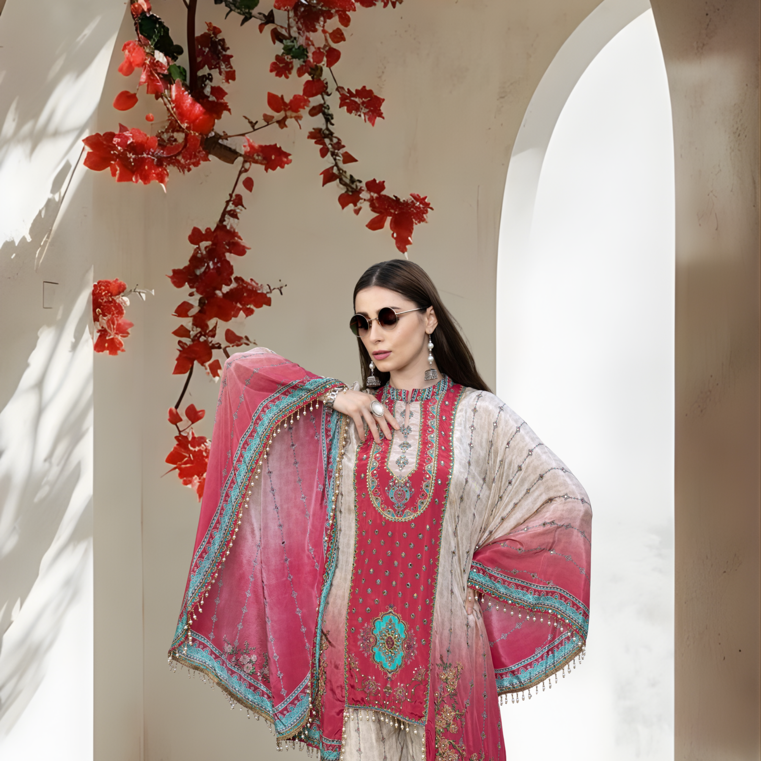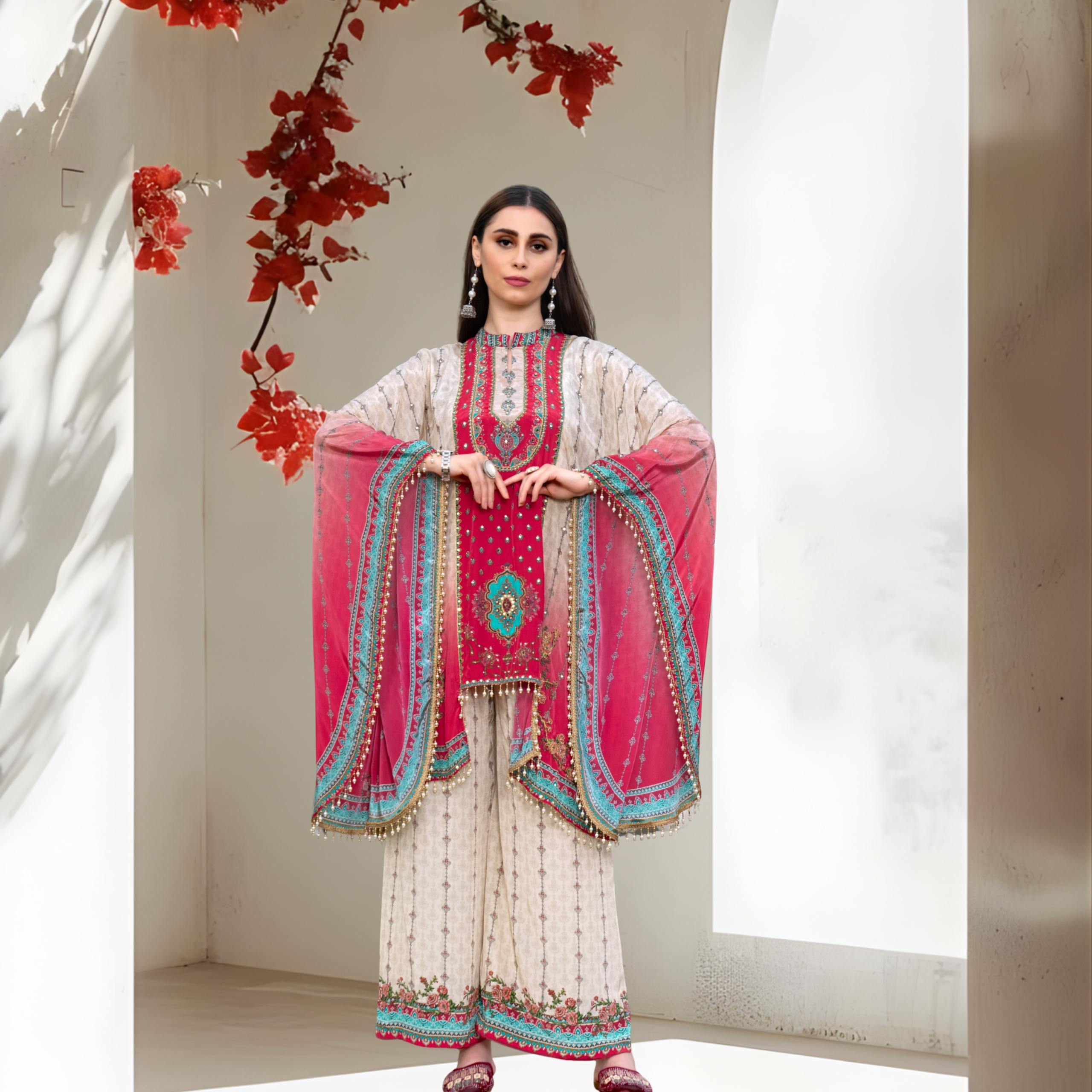 Intricate Artistry: Features a bold fuchsia center panel adorned with traditional embroidery and teal accents.