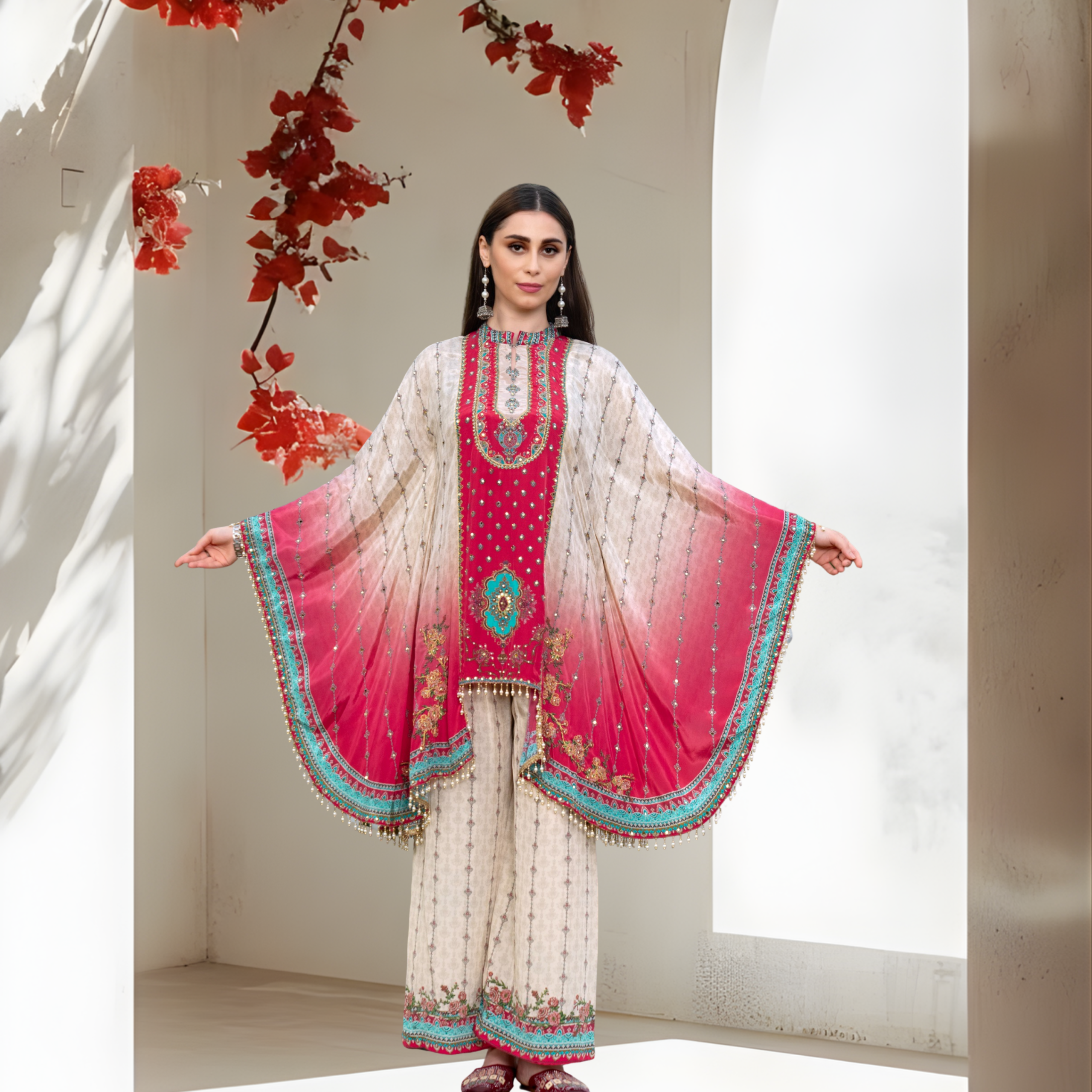 Modern Kaftan Cut: The wide, dramatic sleeves offer a sophisticated, breezy look that blends ethnic charm with modern styling.