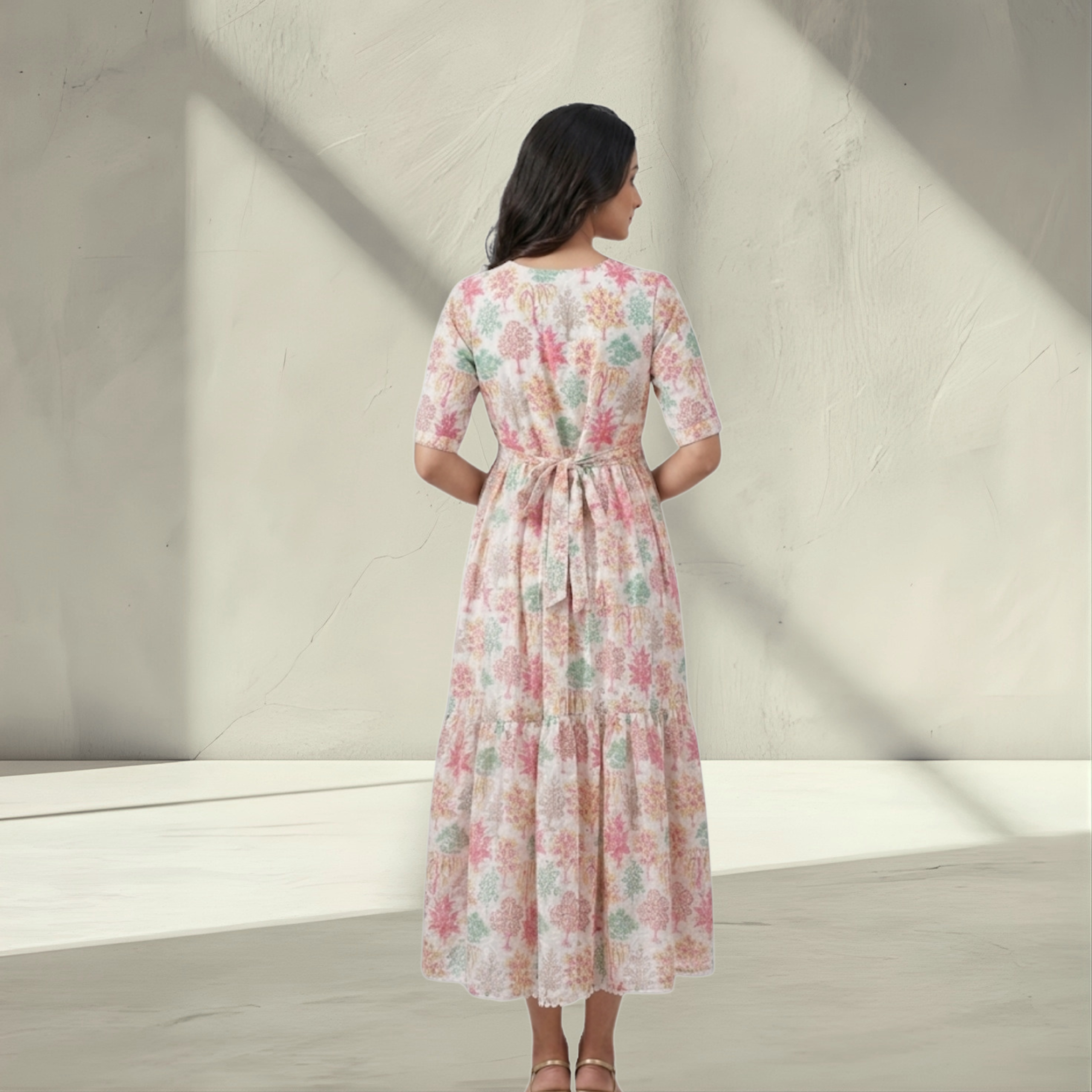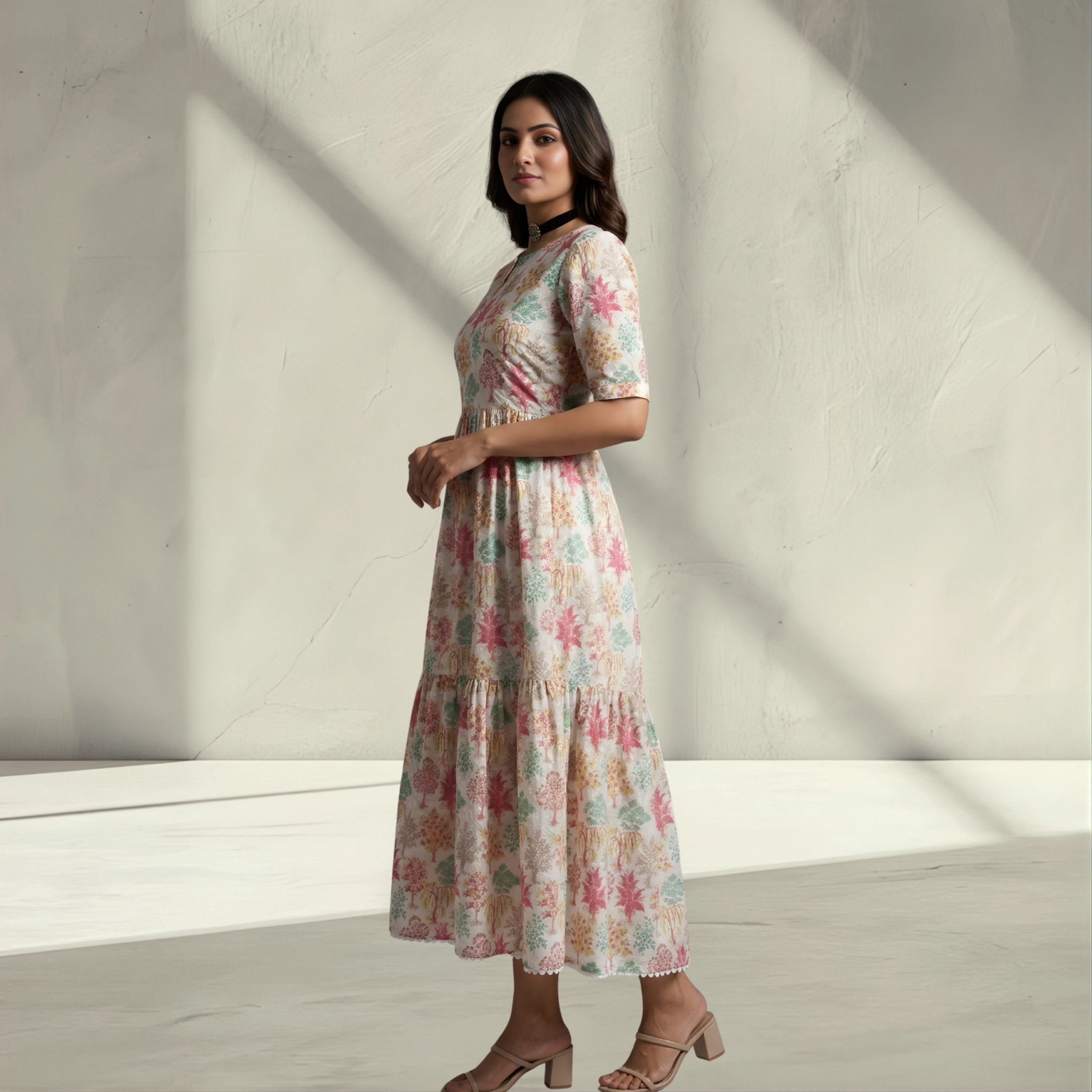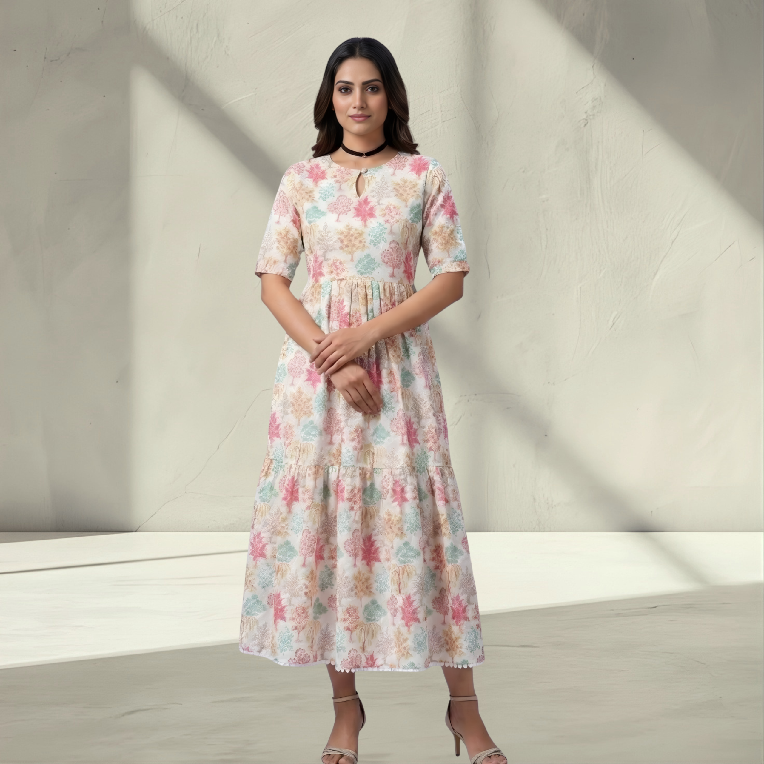 Elegant Pastel Floral Tiered A-Line Dress – Perfect for Summer Brunches