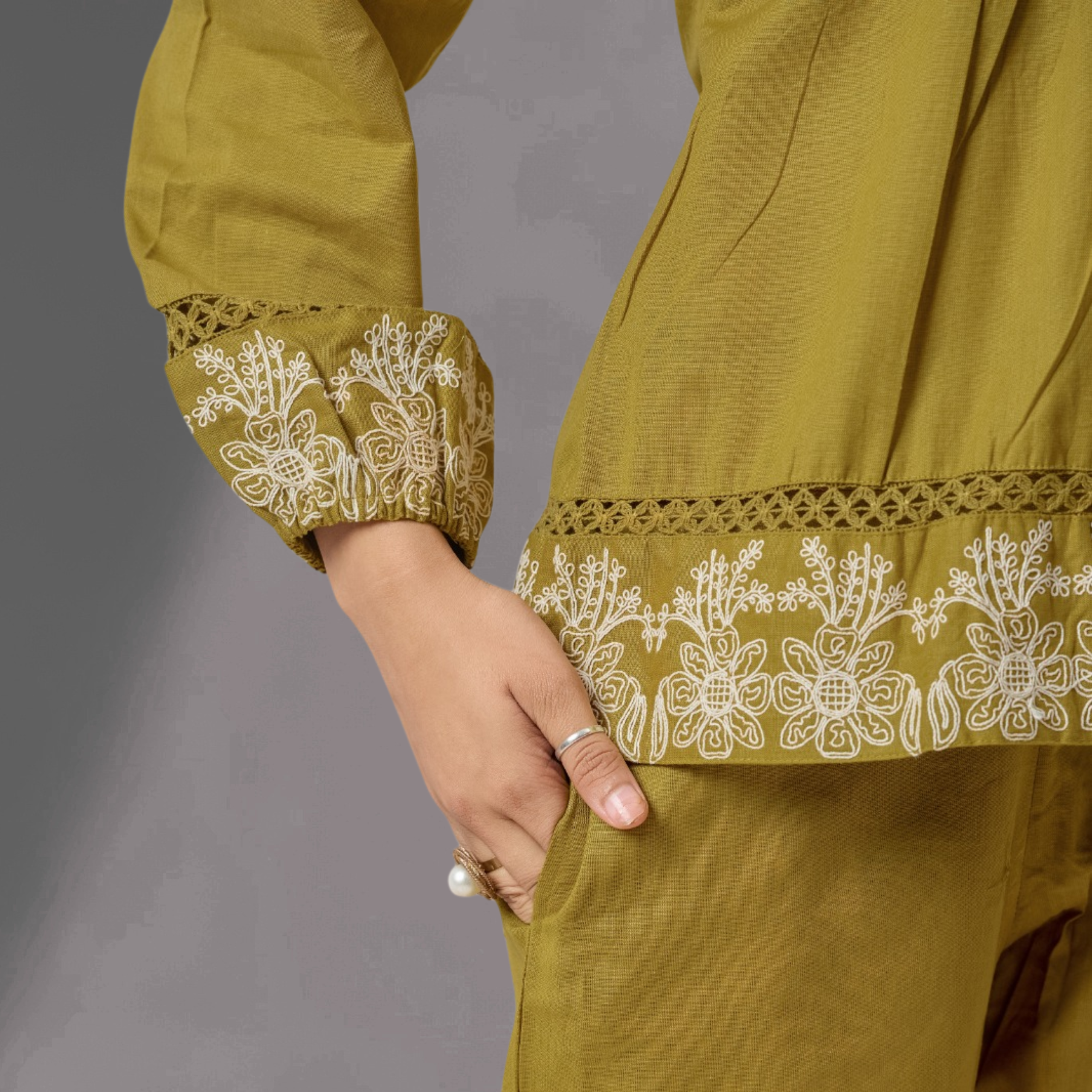 - Sleeves: Full-length sleeves with finely embroidered cuffs
