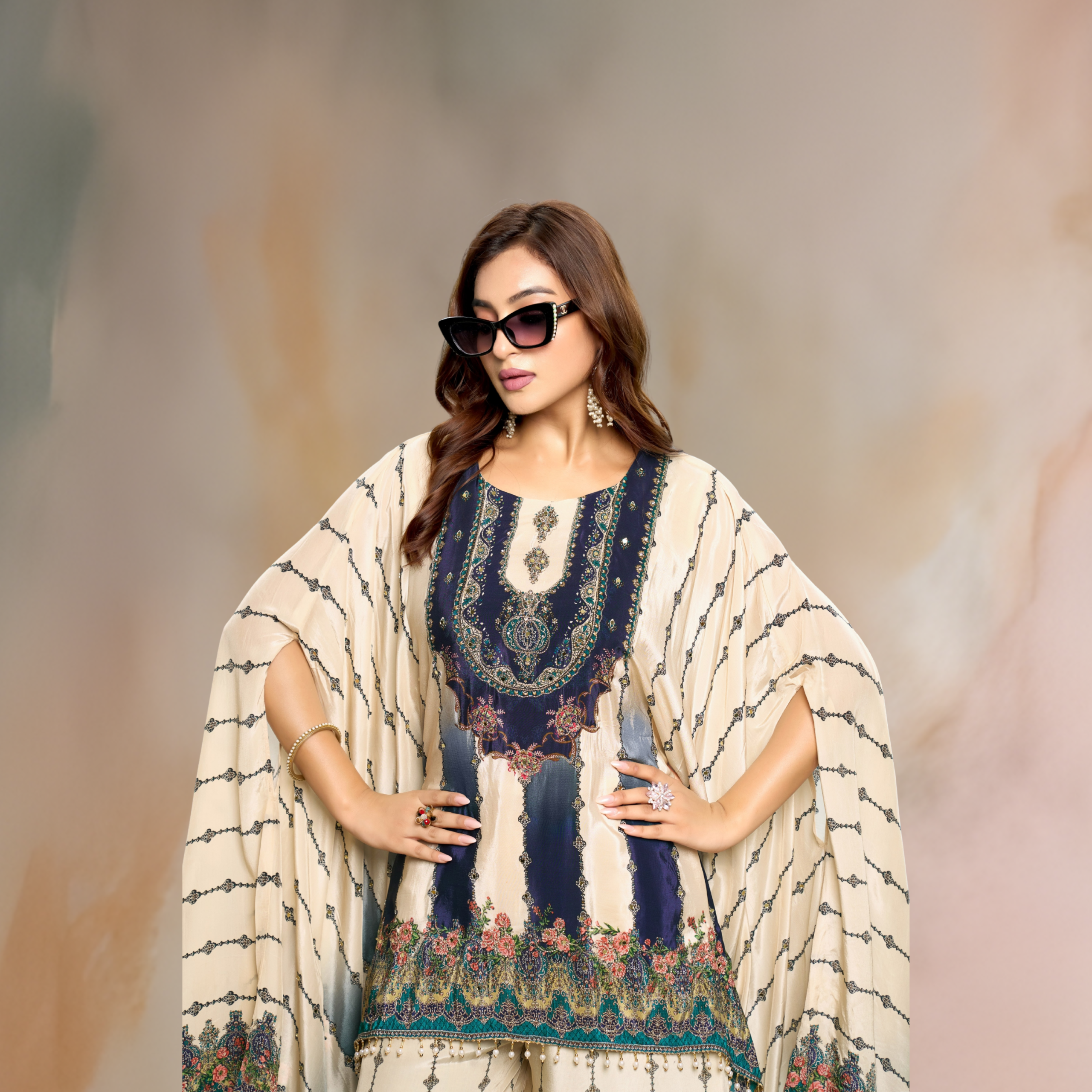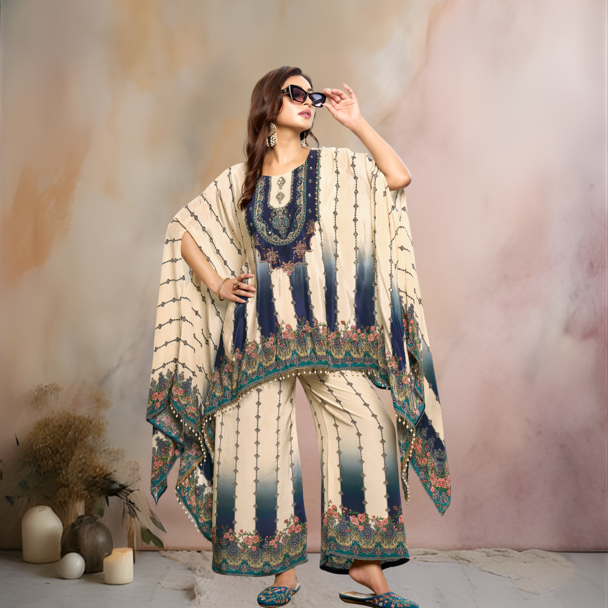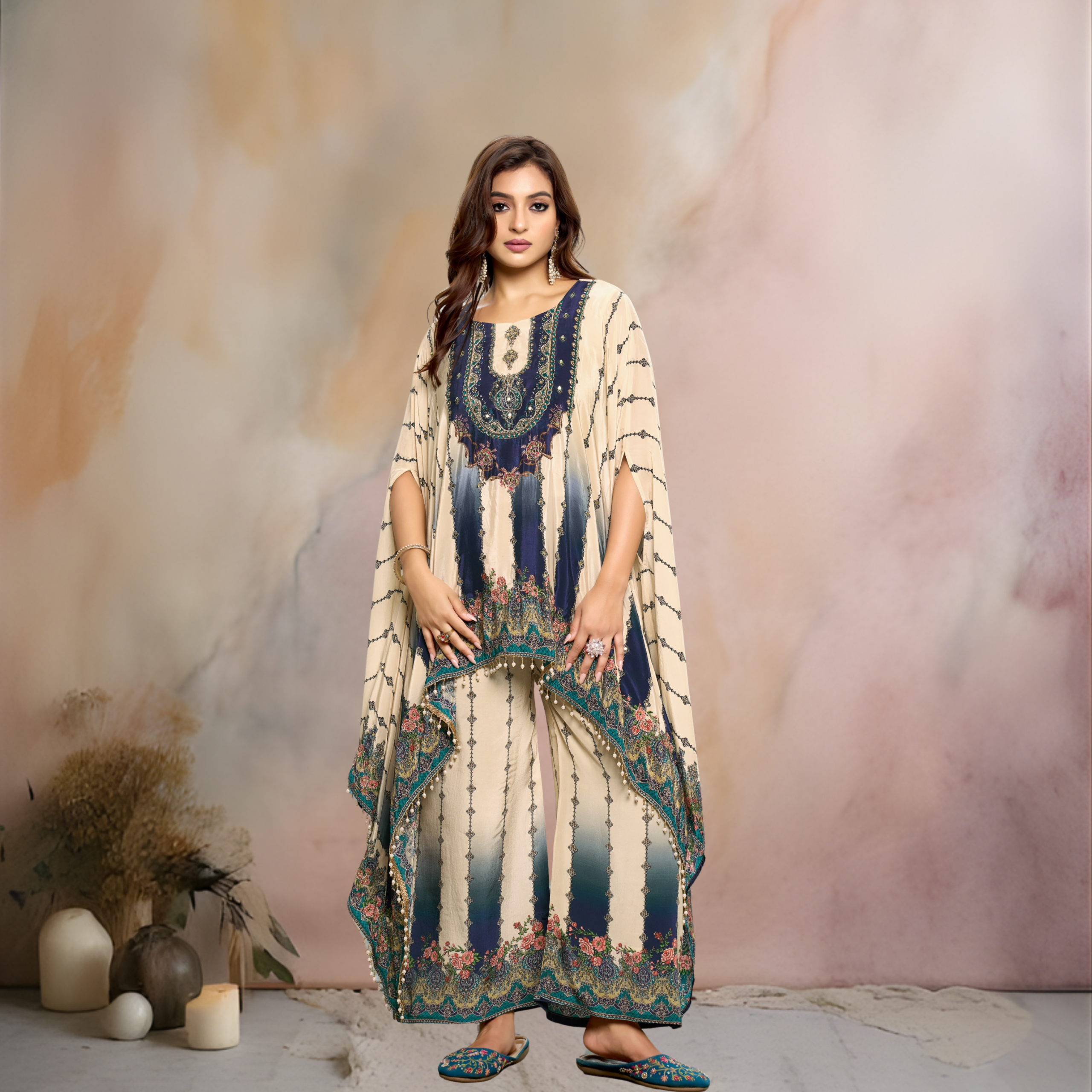 Refined Detailing: The hemlines of both the kaftan and palazzos are finished with intricate beadwork (pearl drops) for a touch of playfulness.