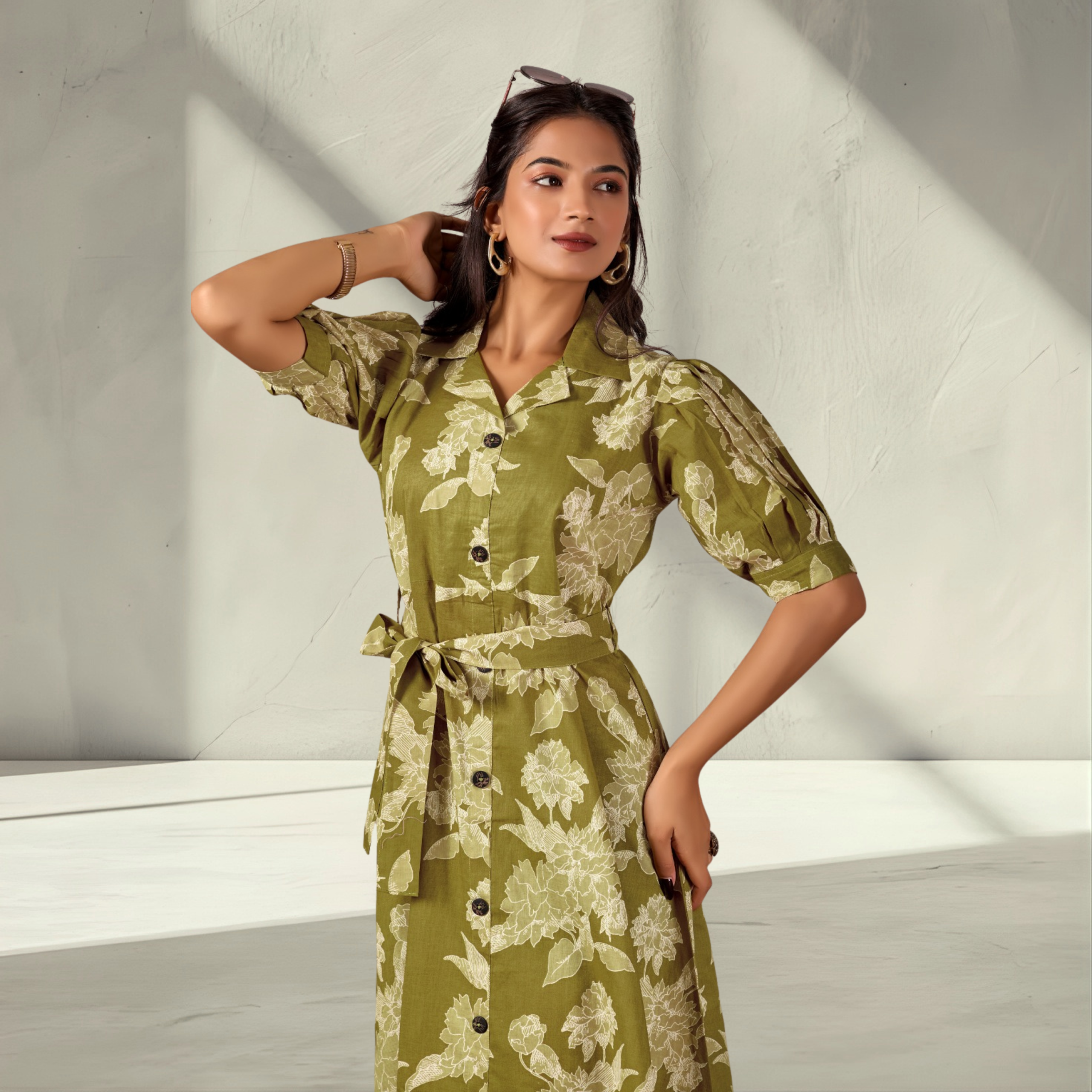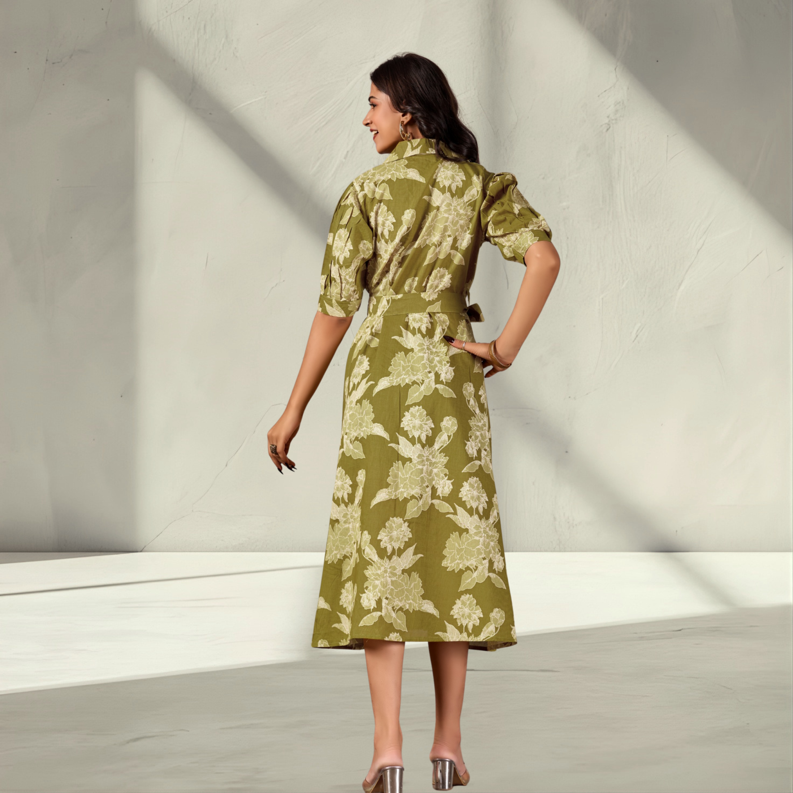 Olive Green Floral Print Cotton One Piece Dress with Waist Tie
