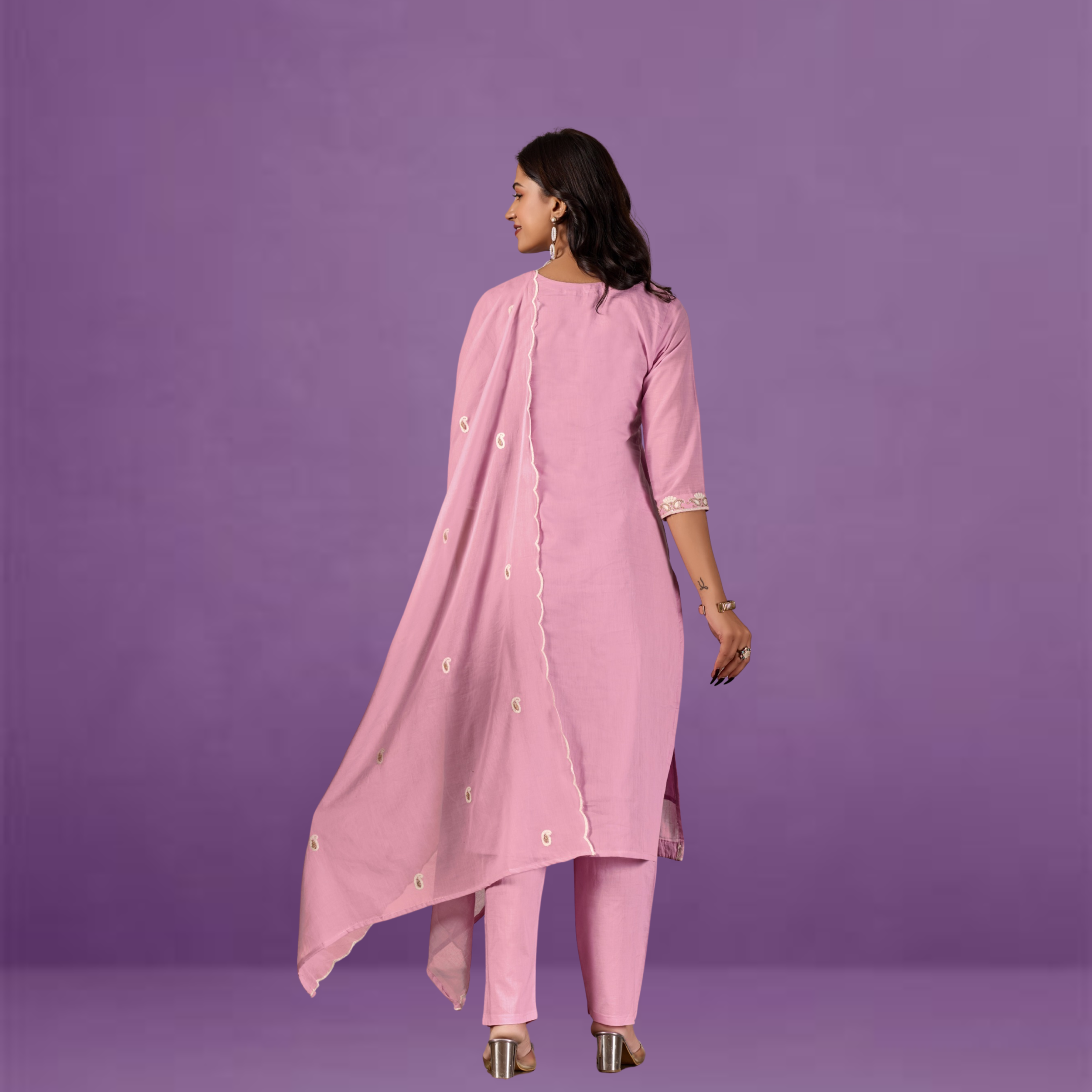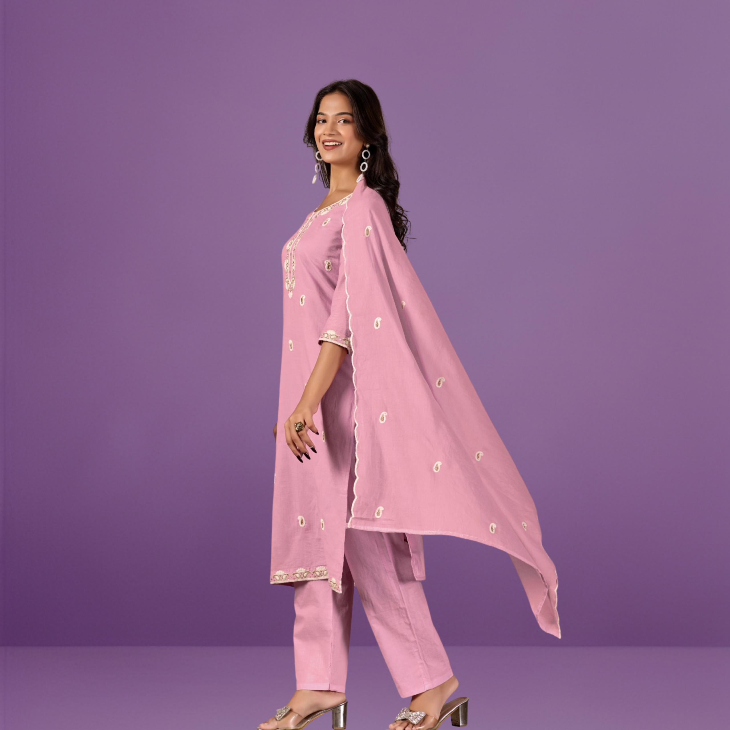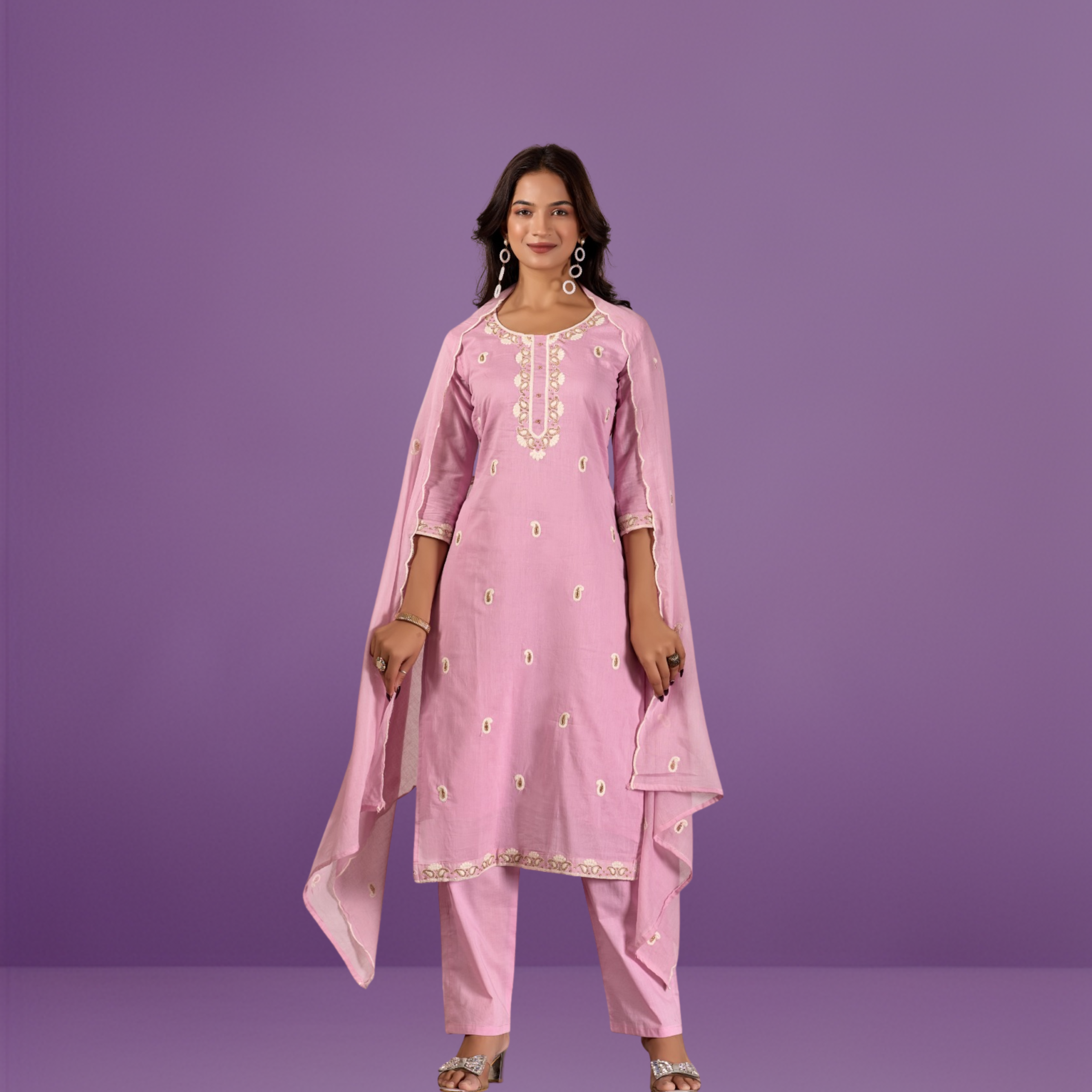 Designer Scalloped Dupatta: Includes a matching cotton dupatta with elegant scalloped edges and motif detailing to complete the ensemble.