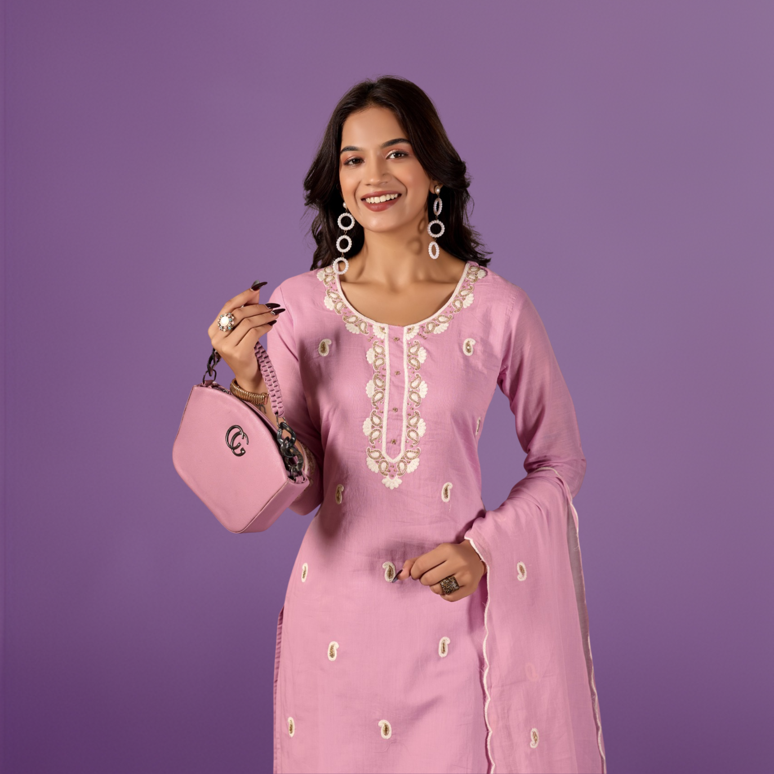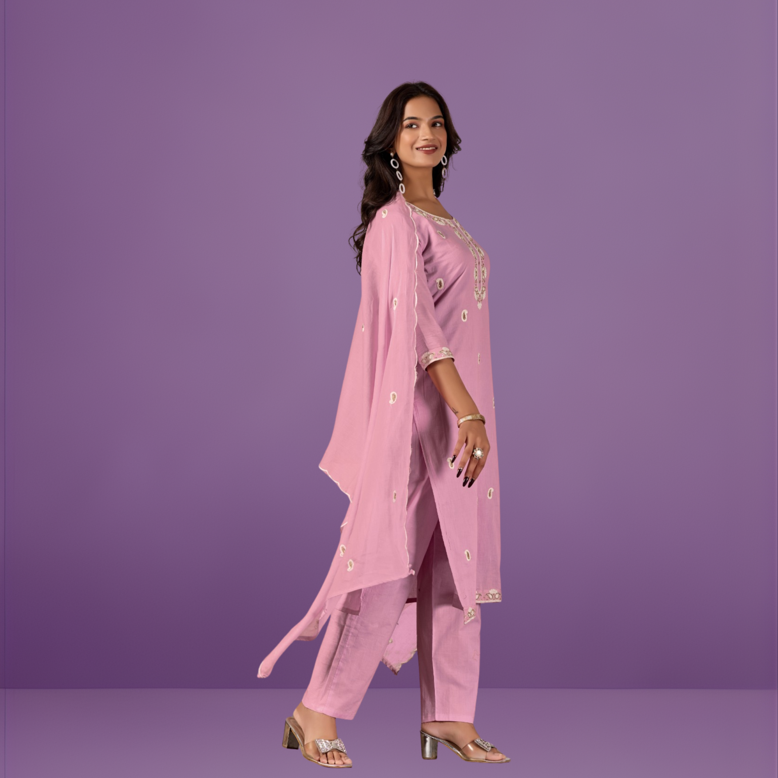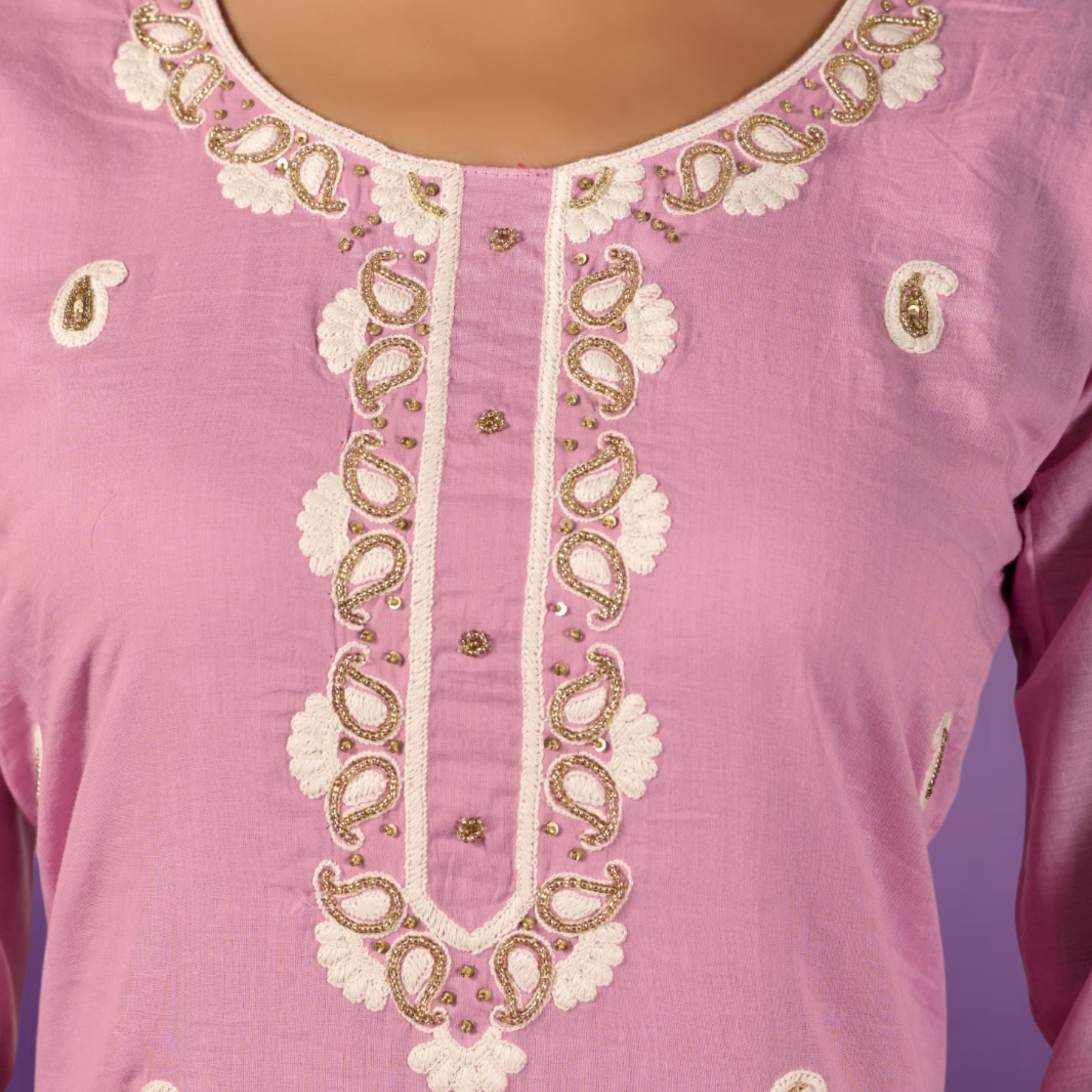 Artisanal Embroidery: Features a beautifully detailed yoke and hemline with traditional white embroidery that pops against the lavender base.