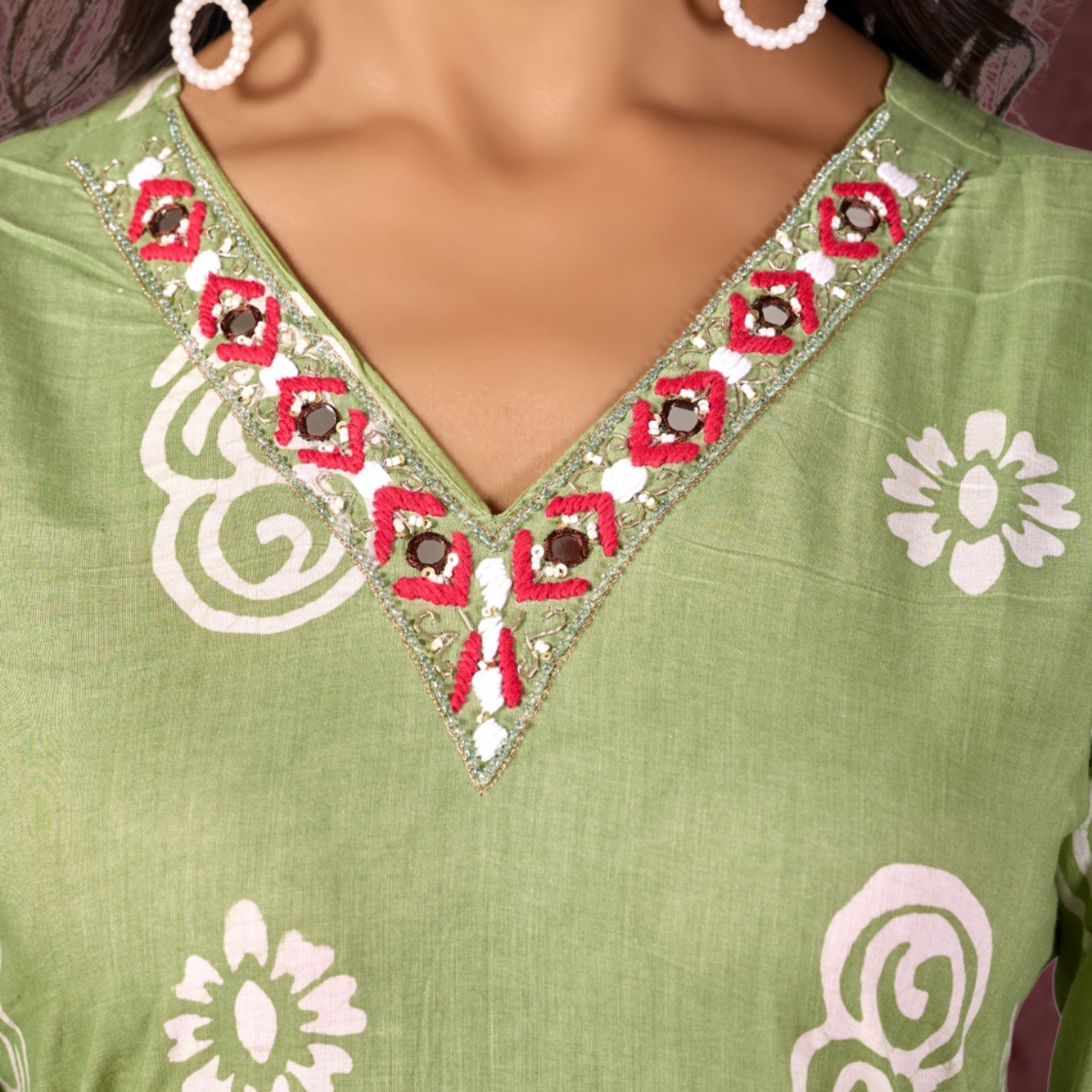 Vibrant Neckline Detail: A beautifully embroidered V-neckline with pops of pink and delicate mirror accents for a festive touch.